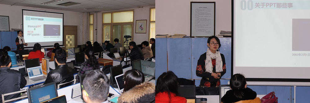 本次工作坊分为“PPT制作”、“午餐会研讨”、“录屏软件使用”三个部分。其中“PPT”制作的主讲杨沛老师以“教育技术培训——让Point更Power”为题,从“关于PPT那些事、为什么要做PPT、这样的PPT好不好、好的ppt是这样的、如何整体构思PPT、如何设计PPT”这六个问题入手,向大家重点阐述了PPT设计的整体思维,从正反实例两个方面例证“好的幻灯片设计必须做到逻辑化+视觉化”的观点。同时,向大家强调了“PPT模板不是万能的”要根据不同的情景选择不同结构的PPT结构,只有这样才能正确的传递信息。最后杨老师带领大家实际操作PPT设计流程,例如页面布局、图形运用及页面制作。在实操环节中,教师们共同讨论、交流,现场气氛十分活跃。