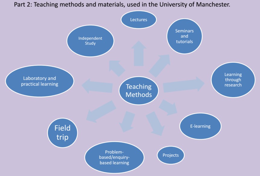在经历了两周的学习、交流后,总结了英国高校课程考核的几种有效手段,包括presentation(演讲)、workshop(小组实操)、report(报告)、essay(结课论文)、exam(考试)等(图一)。