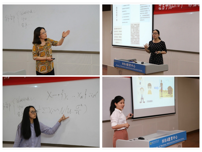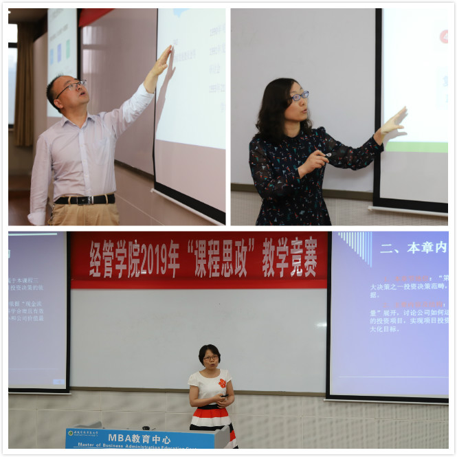 随后,七名参赛选手陆续登场,分别从任教的课程内容出发,将“思政元素引入课堂”,突出以社会主义核心价值观为引领,以理想信念教育为核心。营销教研室教师王谊讲授“产品经理”这一知识点,以“如何移动富士山”这一问题入手,授课注重将理想教育(职业理想和社会理想)和爱国主义教育(将民族自豪感与危机感)相结合。讲解内容由浅入深,通俗易懂,润物无声式地将家国情怀及理想教育渗透其中;农经教研室教师马红玉以“农业经济学”中人力资本方面的知识作为授课内容,将深奥的专业知识贯穿在励志短片中,引导并培养学生在乡村振兴背景下投身农村、服务三农的情怀,引起阵阵掌声;工商教研室新进教师邱璐通过对企业宏观环境案例分析,激发学生对现代企业发展的关注,让学生意识到团队合作与交流在科学研究中的重要性,能够主动地获取除专业知识外的新知识和新能力,提高自身思想文化素质。各位参赛选手在比赛中或互动热烈、或神采飞扬、或诙谐幽默,各具特色,一堂堂课程精彩纷呈,获得了评委和学生的一致好评。