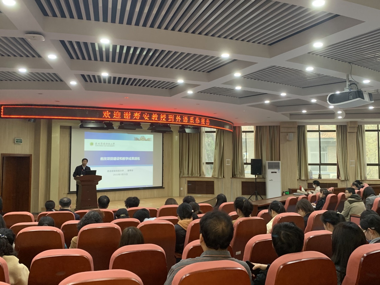3月31日下午,外语系邀请陕西省教学名师、国家教学成果二等奖获得者谢寿安教授作《教改项目建设和教学成果凝练》专题讲座,外语系100余名无课教师参加报告会。