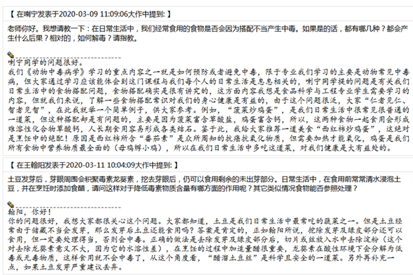 在《动物中毒病与毒理学》网络教学过程中,授课教师在有限时间内采取上述举措,从目前来看,均收到良好学习效果,特别是答疑讨论的互动效果好,同学们围绕自己关心的各类问题在平台上进行了积极互动交流,授课教师从专业的角度对所有问题均给予耐心细致地答复,态度认真积极,回复专业,在师生互动中拓宽了知识、增进了情谊,教学效果良好。当前,在“新冠肺炎”疫情影响下,授课教师应该变不利为有利,化被动为主动,按照学校要求,积极开展《动物中毒病与毒理学》课程网络资源建设,后续我们会在此基础上,进一步完善“在线教育综合平台”各栏目内容,争取尽早建成我校拥有自主知识产权的《动物中毒病与毒理学》网络课程,为我校乃至全国其他兄弟院校毒理学人才培养做出西农贡献。