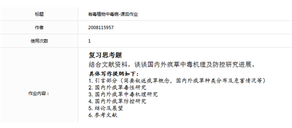 同时,为进一步巩固课堂学习效果,强化课后复习,授课教师在每一章学习结束后,都会布置一道复习思考题,如“有毒植物中毒病”的课后作业题为“结合文献资料,谈谈国内外疯草中毒机理及防控研究进展(附中英文参考文献)”这是一道综述性作业题,其目的除了让学生及时复习课堂所学知识外,更重要的是训练学生撰写综述性文章的能力,为后续本科毕业论文开题报告(设计)和毕业论文的写作奠定基础。