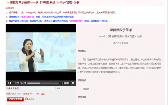 近日,由我校园林学院李侃侃老师主讲的课程思政示范课《环境景观设计——以雨水花园为例》在国家教育行政学院高等教育管理干部网络培训平台上线。
