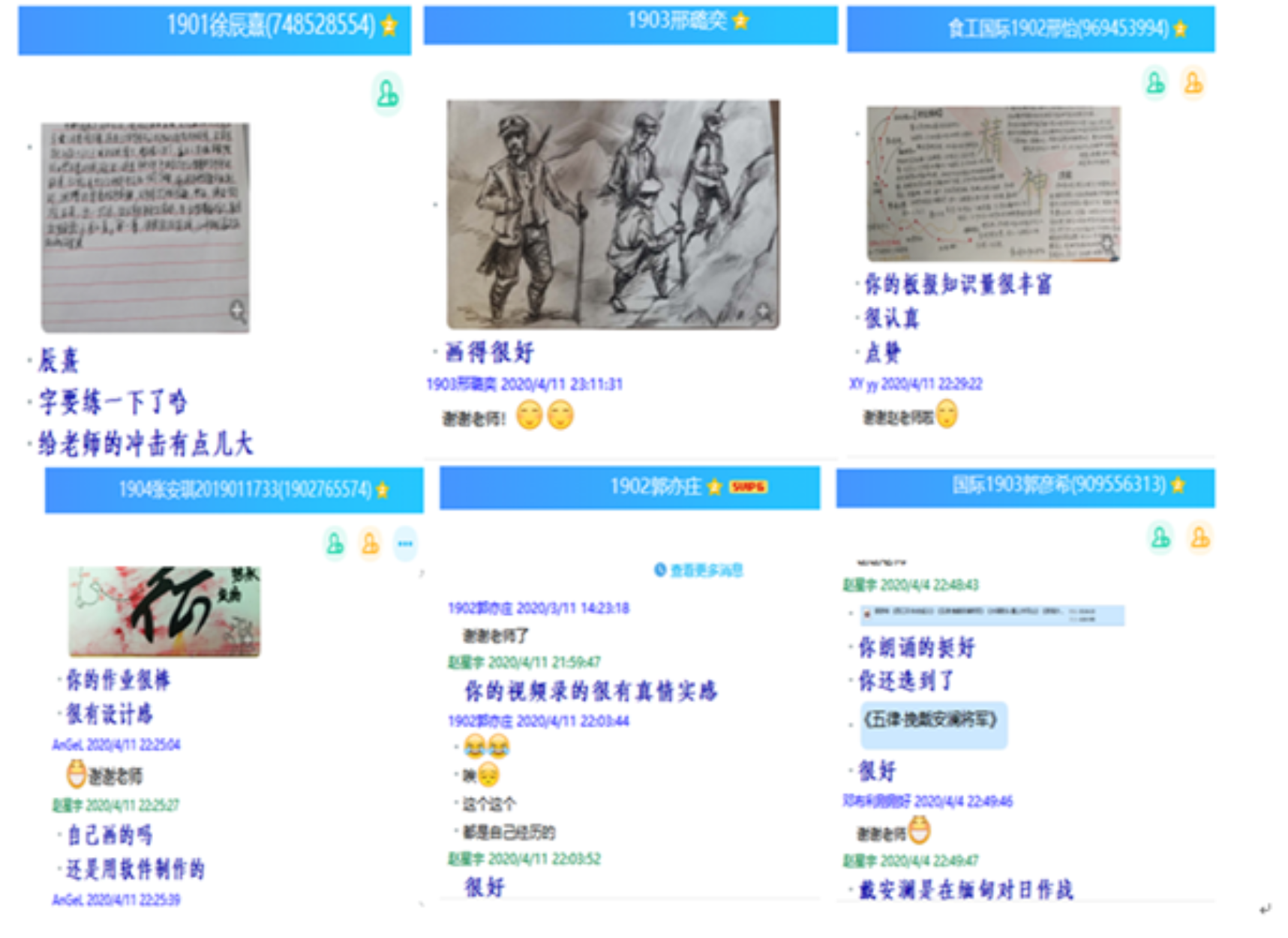 把握近现代历史发展脉络,结合国际国内形势,以立德树人为根本目标,以史为鉴,自强不息,仔细研究零零后学生认知结构,性格特点,布置个性化作业。一是要求学生借鉴古代诗词中名句,结合抗击新冠状病毒特殊时期,书写大学生的使命与担当;二是组织学生认真听取教育部“特殊”的思政课,在线上发起讨论;三是组织学生线上观看《圆明园》纪录片,培育学生爱国主义情怀,让同学们勿忘历史,牢记使命,继续前进;四是学习长征专题,结合大学生成长成才,鼓励学生忆苦思甜,创作《我的长征》小论文。丰富新颖的作业让同学们在家学习不枯燥,累计收到学生高质量作业一百余份,充分调动了学生搜集各类材料的能动性,培养了学生的家国情怀。