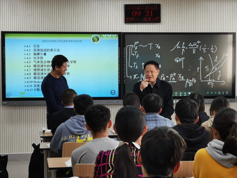 段连运教授在化药学院院长高锦明教授、教学副院长周文明教授和省级教学名师王俊儒教授的陪同下进入应化专业18级课堂,一同观摩王林副教授《物理化学》课程,充分肯定了王林的案例式、启发式、拓展式教学,指出:“教师只有将课程内容紧密联系本校专业特点,才能激发学生兴趣及热情,促进专业学习。”