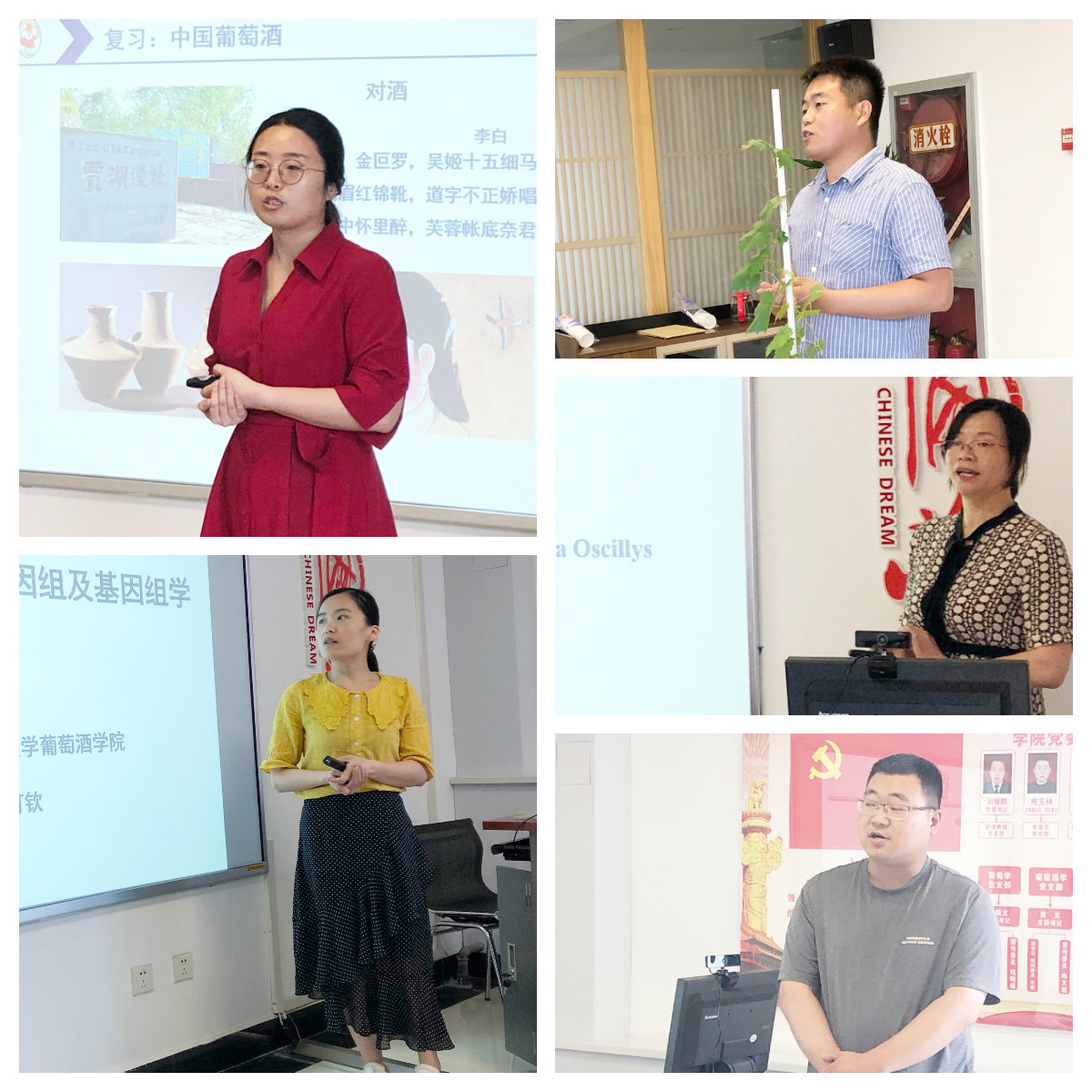 本次竞赛要求各参赛教师自主选择1个知识点融入思政元素,完善并提交教学设计。在15分钟现场教学展示中,参赛的10位老师结合所教授课程的具体章节或主题,各具特色地融入了思政元素,巧妙地将专业知识的学习和思政教育两者结合起来,充分展现了我院教师丰富的教学经验和扎实的思政理论。李运奎老师全程将思政教育元素融入到学生的葡萄酒工厂生产实习中,使学生深切感受到在党的领导下穷山变“金山”的巨大转变;陈可钦老师以“相似的特色手指”为导入,讲述了基因理论的发展,并融入“质疑精神”;张克坤老师将一棵葡萄树搬入“课堂”,从葡萄树的副梢管理联系到大学生要合理规划课余兴趣这一“副梢”,将更多精力放置于学业这一“主干”上;杨继红老师以除梗设备的选择为切入点,综合实际案例,说明了具体问题要具体分析的辩证思维方式;董树萌老师在讲授酒庄运营与品牌策划中,讲述了“毛泽东致李达信”这一党史典故,在党史中回应知识;段婧老师通过品尝葡萄酒器具的演变来反应人民对美好生活的向往就是我们党的奋斗目标;杨晓兵老师以葡萄酒微生物学知识点阐述了中国人用中国粮酿中国酒这一主题;姜娇老师在葡萄酒工艺学的讲授中讲到:创新、精益、专注、敬业是工艺人的精神,更应该是学生的品质。王现行老师以切身之感讲述了我国种业被“卡脖子”的问题,呼吁各位同学努力学习,搞好民族种业,保障粮食安全;刘文政老师将离心泵的工作原理哲学化,阐述了在生活和学习中有付出,才会有收获;将欲取之,必先予之。