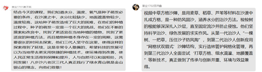 在课程教学中,顺应当代大学生的思维特质,时时融入课程思政元素。例如,学绪论时,从草业科学专业角度让学生在疫情防控期间居家通过网络资源调查自己家乡草种业的发展现状,结合学科前沿和2020年中央一号文件精神,分析认识草种业在家乡的发展态势及在生态文明和生态环境治理中的重要作用。学习牧草种子萌发时,将八步沙六老汉林场治沙的视频发到QQ学习群中,让学生根据所掌握的知识分析在极度干旱条件下如何使沙漠变绿洲,并对六老汉治沙精神发表看法(图5)。