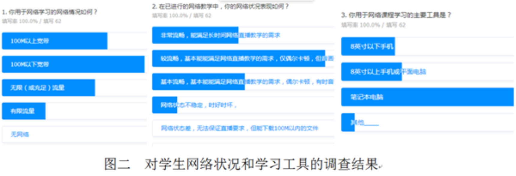 为了能让学生获得更好的教学体验,团队教师还通过网络调查问卷的形式了解了学生的网络状况、学习工具及学生最为喜爱的学习平台等基本情况,并根据调查结果对自己的教学方式、方法和手段进行了调整。这样的调整收到了很好的效果,学生课堂参与度提高。