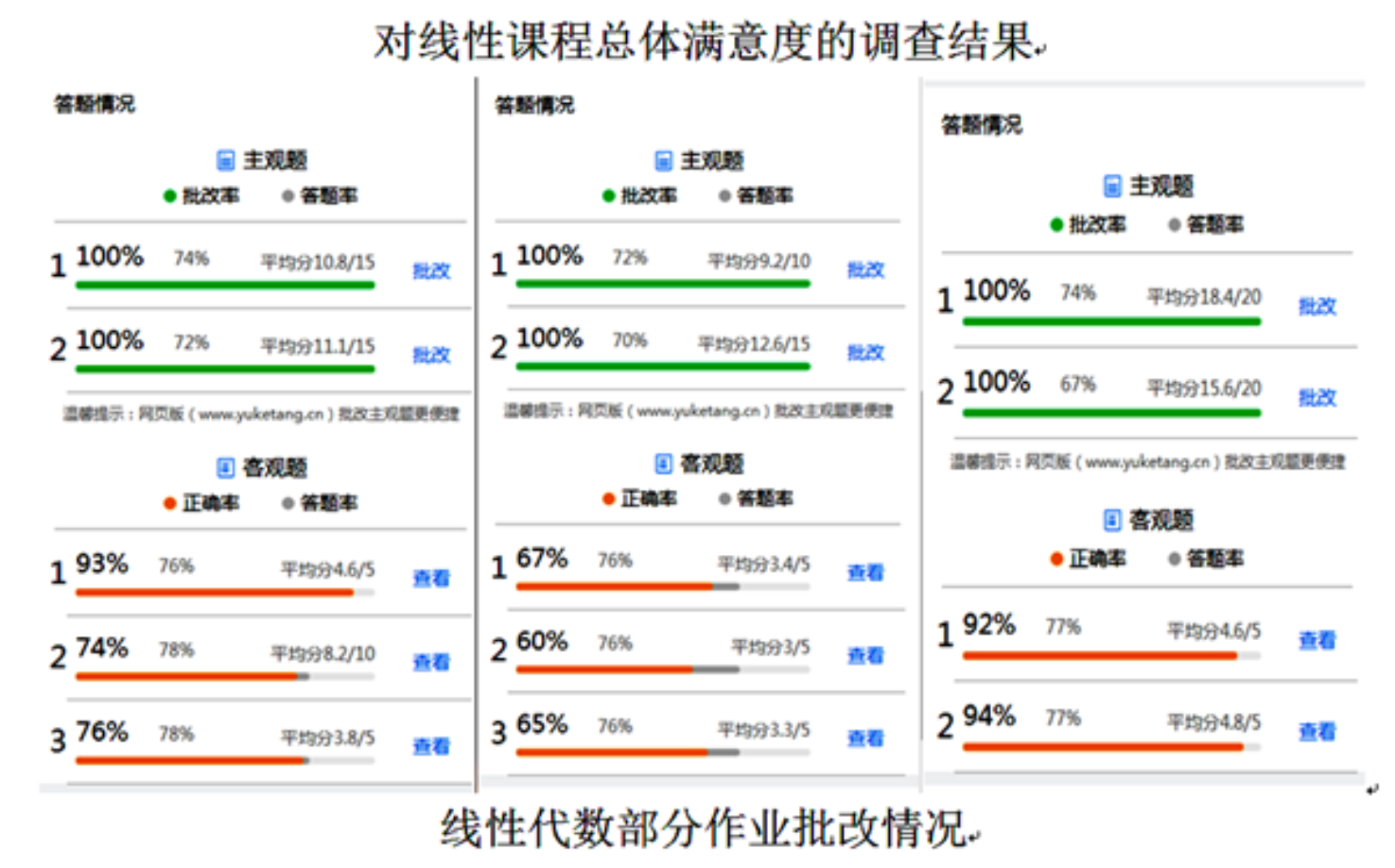 老师们的这些努力也收到很好的效果,在后期团队组织的网络匿名调查中,课程的总体满意度达到了89.6%,且没有对课程表示不满意的同学。从课后作业的情况看,教学效果也基本达到或超过了教学大纲和课程质量标准的要求,与线下教学基本相当。