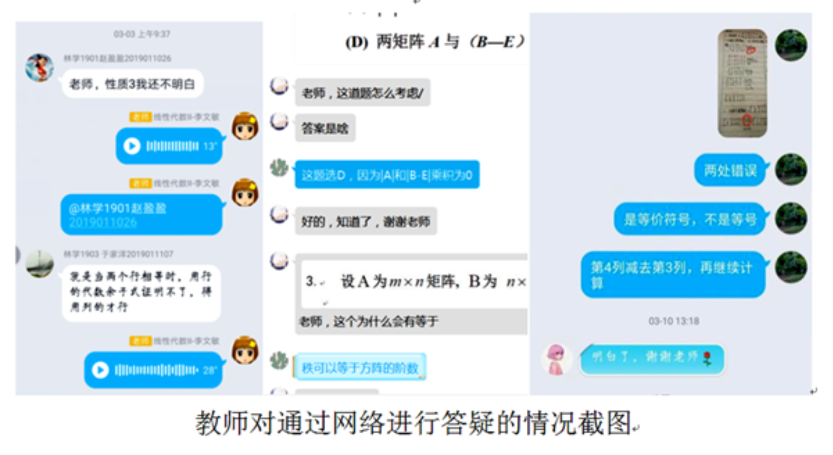 对学生反映的教学资源不足,使用不便等问题,团队教师将教学资源更加细致的分类整理,并全部上传至教学QQ群供学生使用。此外,针对数学类课程的答疑过程中,公式符号较多只用语言描述难以达到彻底解决问题的情况,团队教师也因地因时制宜,利用视频通话、书写后拍照等方式进行及时的答疑。