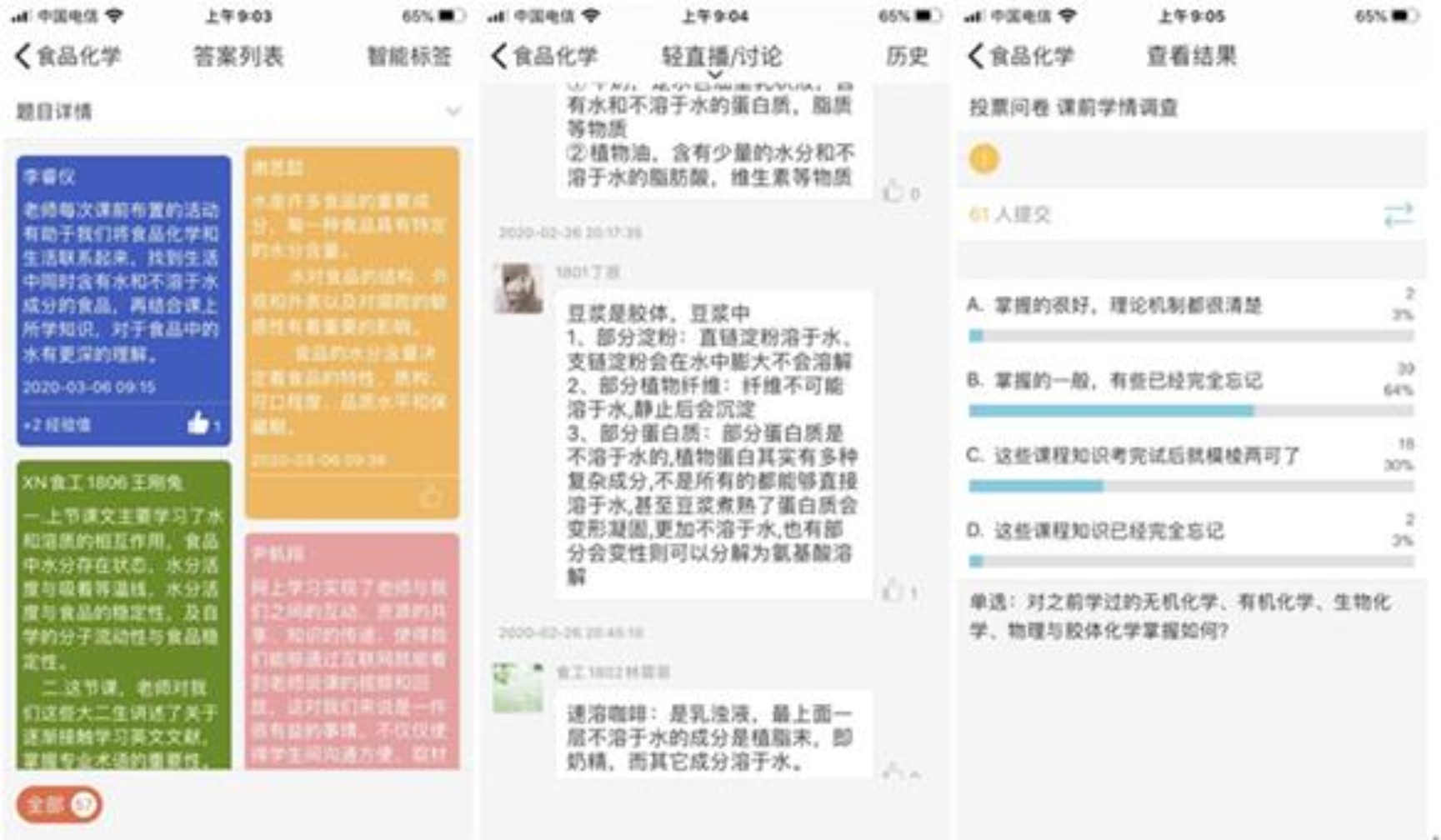 为监控在线教学状态、保证教学质量和效果,食品化学教学团队鼎力合作,主讲教师和助教全员参与教学活动,积极开展网络课程教学,包括资源的收集、学生学情调查以及课后作业的评价、学生个性化教学分析等方面,并及时回答在线教学中的学生问题。收集学生对于网络教学的建议和意见,分析总结,不断调整教学思路和方案,提高教学效果。学生反馈说“不仅仅使得学生间沟通方便、取材灵活、疑难问题得到及时解决,更能使老师时空自主、拓展视野、取长补短”。